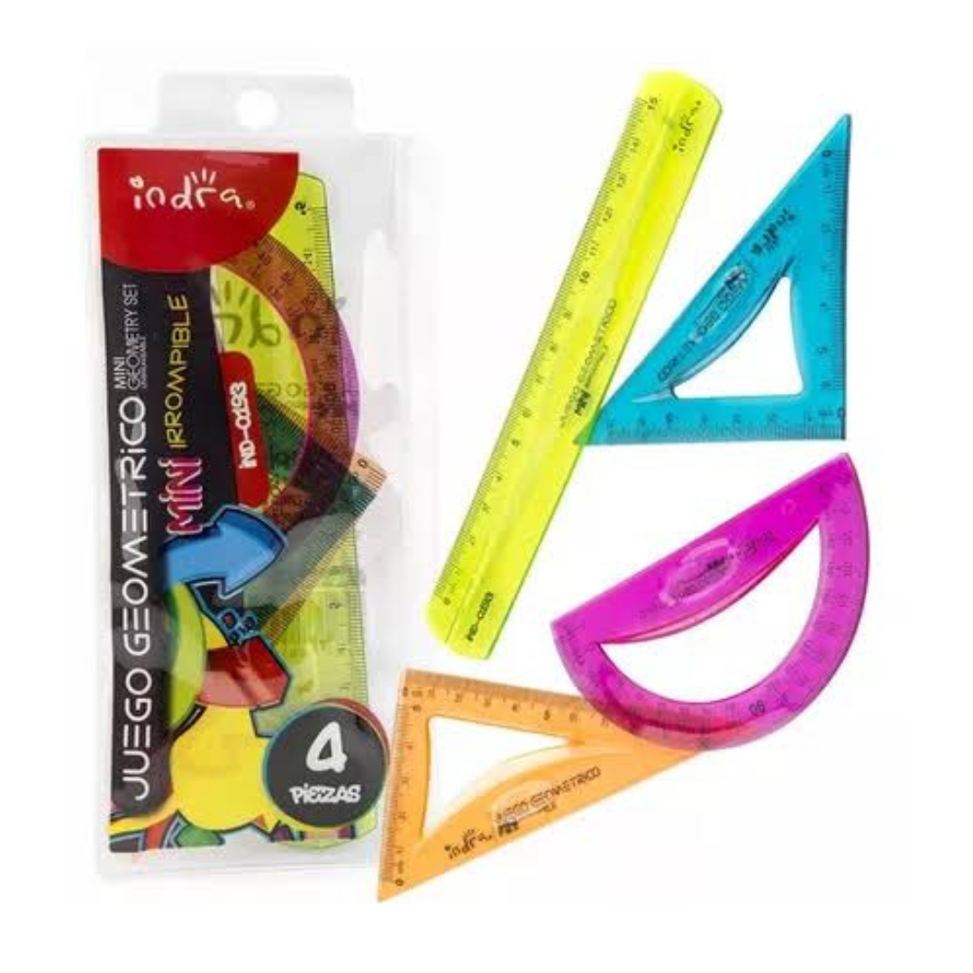 💕Juego geométrico mini irrompible Indra: perfecto para estudiantes o profesionales. Incluye 4 piezas flexibles y coloridas: regla de 15cm, escuadra de 45 y 60 grados, y transportador de 180 grados.