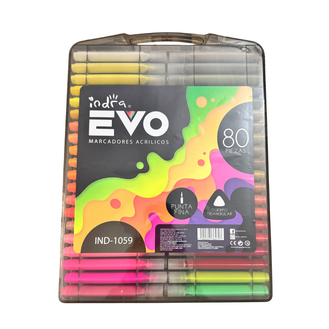 ✨Los marcadores acrílicos Evo de Indra con 80 con cuerpo triangular son perfectos para crear diseños precisos y coloridos. Con su punta pincel, podrás hacer trazos finos y gruesos con facilidad.