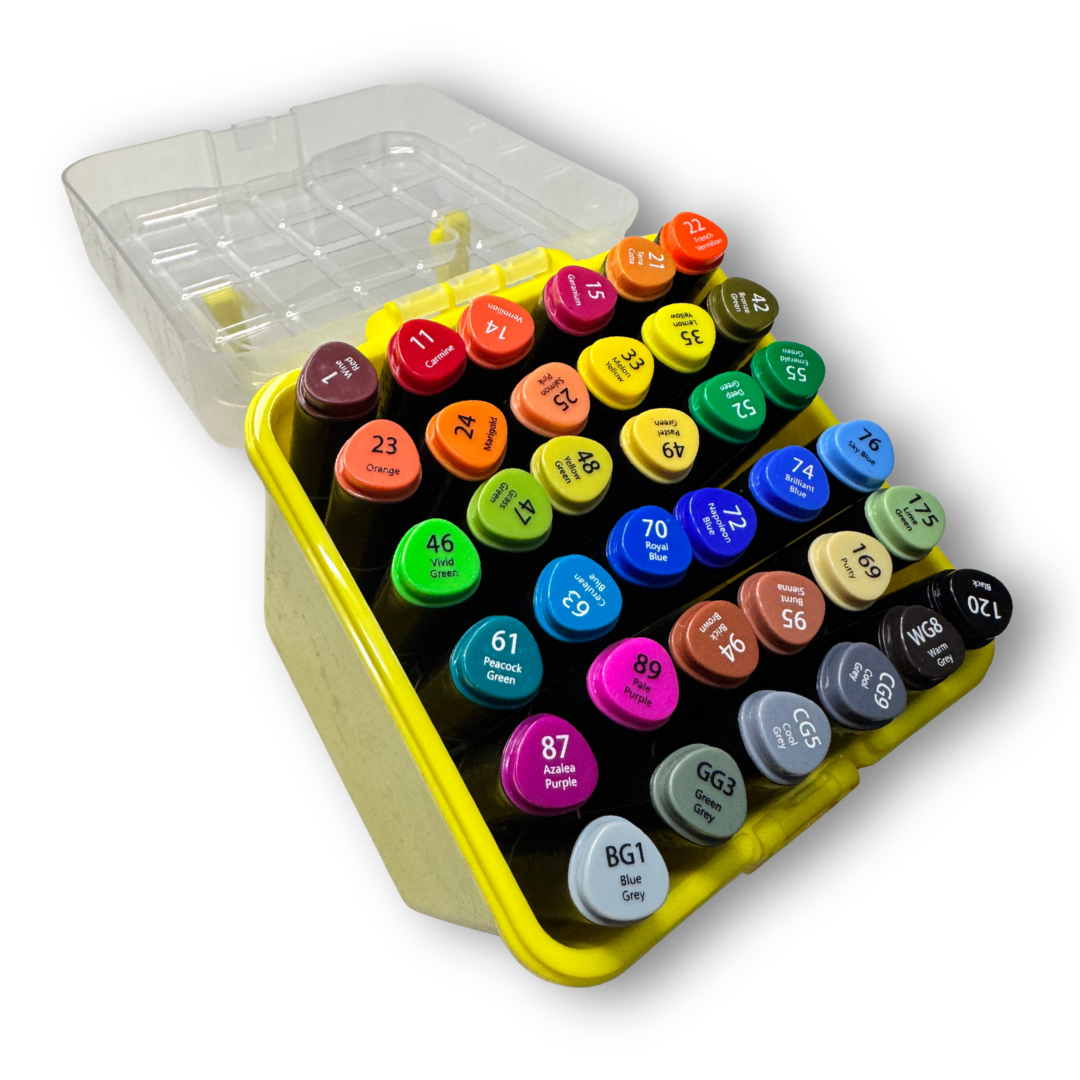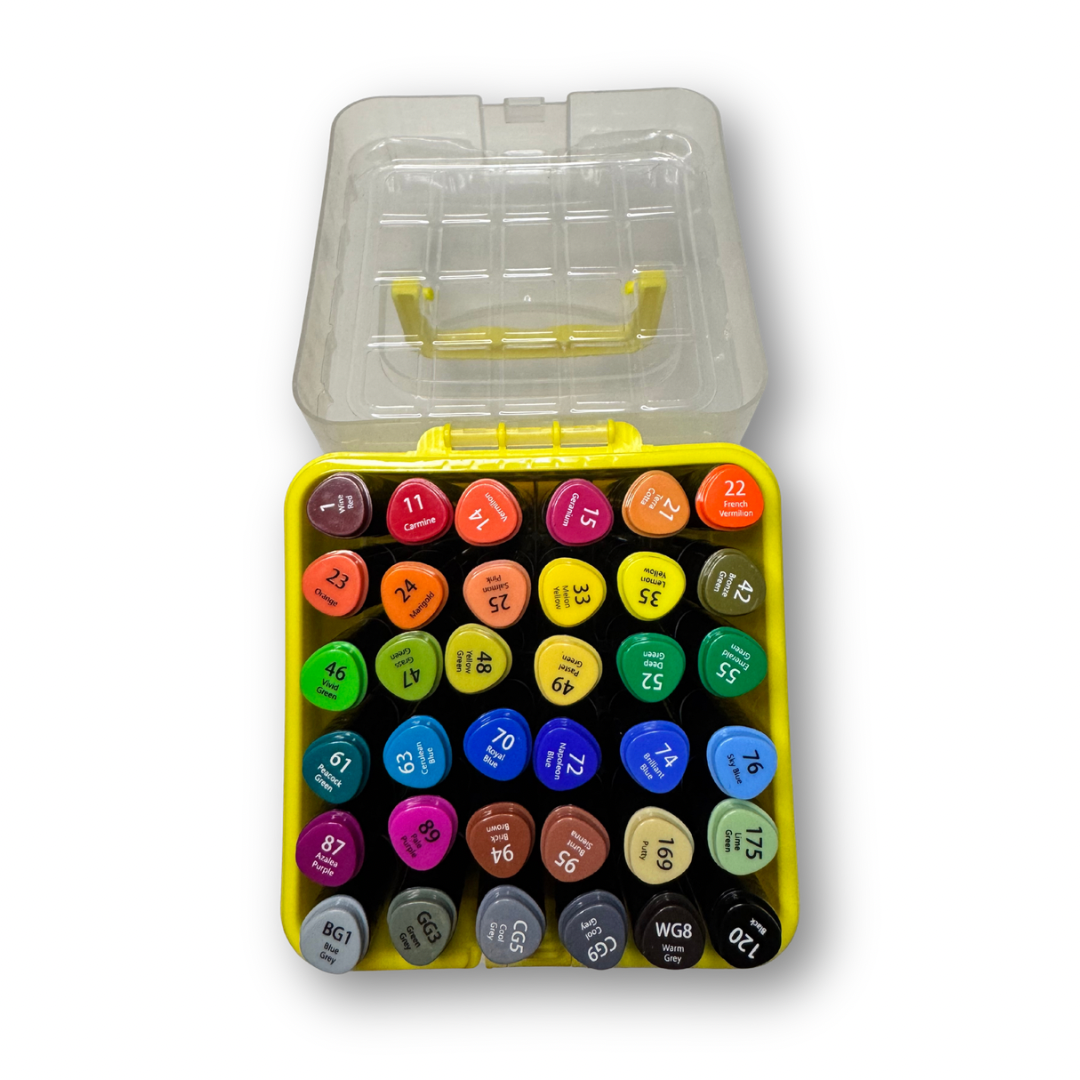 💛Este estuche de plástico contiene 36 marcadores de doble punta, una cincel y otra fina. Con base de alcohol, estos marcadores son ideales para bocetear y dibujar. Aprovecha sus dos puntas para lograr diferentes grosores y detalles precisos en tus diseños.