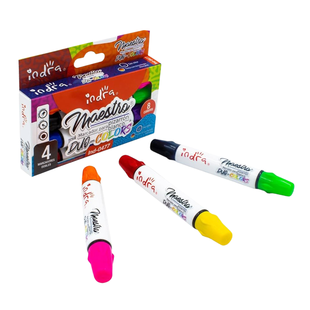 🤍Actualiza y mejora tus presentaciones con los marcadores para pizarrón blanco de la marca Indra con doble punta. Obtén 8 colores intensos y precisos en 4 piezas, perfectos para resaltar y escribir con punta redonda.